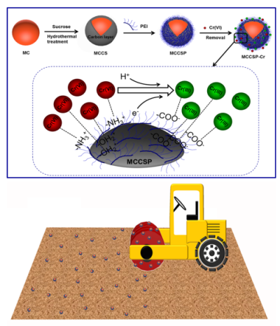 吴正岩课题组以磁性陶粒为载体,利用蔗糖等天然材料,制备出一种功能化磁性纳米复合材料,既可高效抓取土壤中六价铬,将其转化为微毒性的三价铬,又可通过自主研发的磁分离系统将铬从土壤中高效移除,从根本上解决了土壤重金属污染问题。该方法环境友好、使用简便、可重复利用,为土壤重金属治理提供了新的方法,具有良好的应用前景。